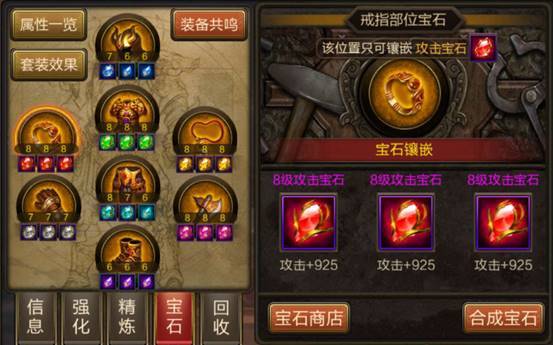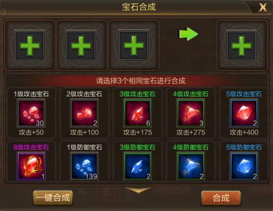 4.三颗相同宝石可合出一颗高级宝石。宝石等级越高所加属性越高,宝石最高等级为10级。